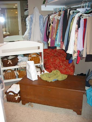 This is our closet, with our red comforter in the corner, Liam's changing table and Megan's toy chest.